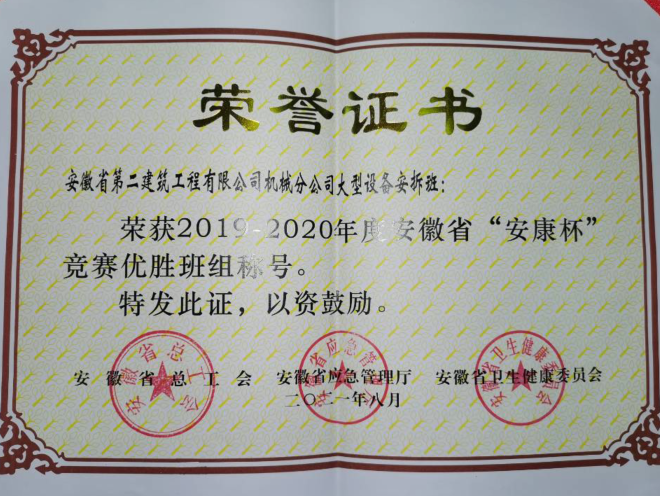 安徽二建公司機械分公司大型設(shè)備安拆班是一支負有戰(zhàn)斗力的班組,擔負全公司大型設(shè)備安拆維保任務(wù)。安拆班現(xiàn)有職工18人,包含4名黨員,4名入黨積極分子,主要負責(zé)大型設(shè)備的安拆、加節(jié)、維修保養(yǎng)及施工現(xiàn)場外電防護安裝作業(yè)等工作。多年來,安拆班始終堅持安全生產(chǎn)理念,開展以“安全生產(chǎn)月”“安康杯”為重點的競賽活動。從細節(jié)入手,樹立零違章理念,堅持教育和懲罰相結(jié)合,落實責(zé)任、夯實基礎(chǔ),避免不安全事件的發(fā)生。通過強化管理較好的完成各項指標,班組曾多次獲得建工集團、公司“先進集體”等多項榮譽稱號,2019年,分公司被合肥市建筑工程協(xié)會評為“2018年度起重設(shè)備安全管理先進企業(yè)”,次年,又被合肥市建筑工程協(xié)會評為“2019年度合肥市建筑業(yè)優(yōu)秀起重設(shè)備安裝工程專業(yè)承包企業(yè)”。2020年,分公司大型設(shè)備安拆班榮獲2019-2020年度安徽省“安康杯”競賽優(yōu)勝班組稱號,這份榮譽屬于公司,也屬于每一個奮勇投身特種設(shè)備安全的一線作業(yè)人員。