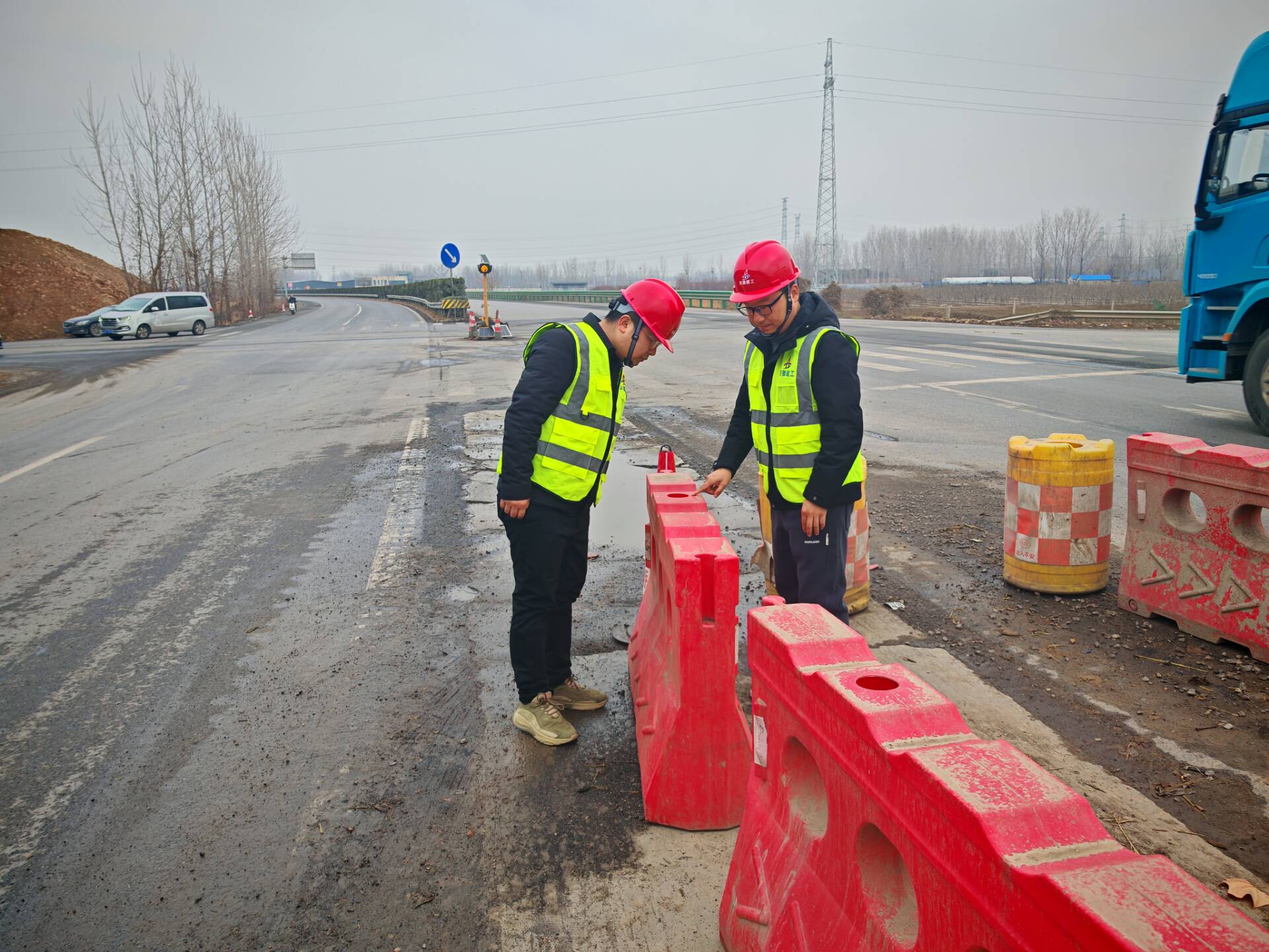 徐淮阜交安機(jī)電綠化工程項(xiàng)目技術(shù)負(fù)責(zé)人張楠楠和核算員鄭全勝正在進(jìn)行涉路道口安全檢查