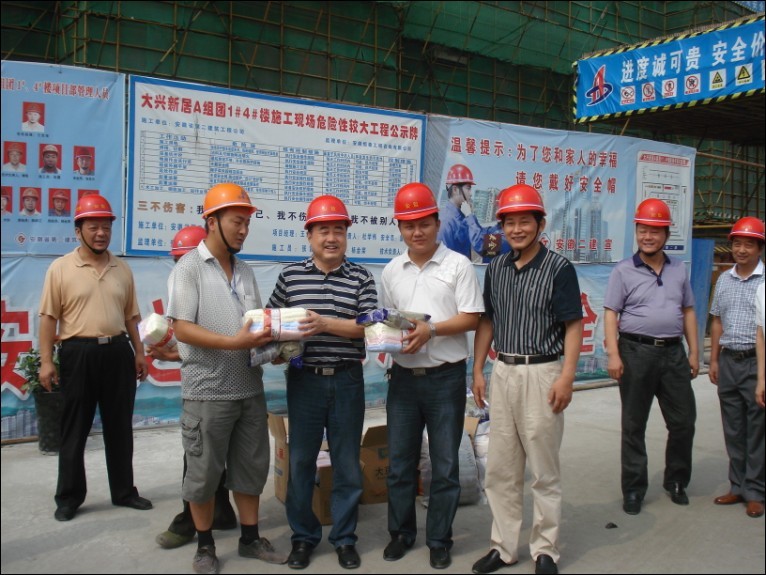 7月17日上午,集團公司黨委書記、董事長胡運成,工會主席、紀委書記牛曙東等一行在安徽二建公司總經(jīng)理戴樹明、黨委書記朱治淮、工會主席李林等陪同下,冒著酷暑,來到了二建公司承建的大興新居A組團1#、4#項目安置房工地,親切地慰問了生產(chǎn)一線職工,并送去了防暑降溫物品。