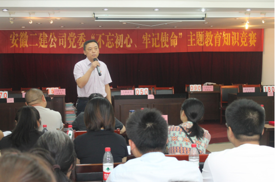 為進(jìn)一步增強(qiáng)“不忘初心、牢記使命”主題教育的參與度,營造良好的學(xué)習(xí)氛圍和群眾基礎(chǔ),做到宣傳教育全覆蓋,9月17日上午,安徽二建公司黨委開展“不忘初心、牢記使命”主題教育知識(shí)競賽。所屬黨支部9只隊(duì)伍參加本次知識(shí)競賽,公司有關(guān)領(lǐng)導(dǎo)、黨群部門負(fù)責(zé)人、所屬各黨支部書記、團(tuán)支部書記出席活動(dòng)。